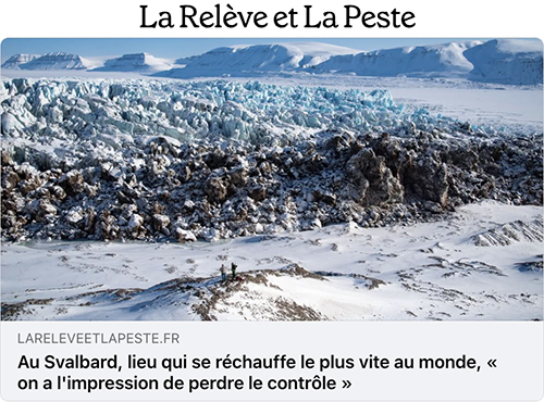 GLACIERS D'ARCTIQUE, ÉTAT DES LIEUX dans LE PARISIEN ![]() Replay de C À VOUS, à 24'04 min ![]() Chronique sur Radio Classique ![]() Replay de ÉLÉMENT TERRE ![]() GLACIERS D'ARCTIQUE, ÉTAT DES LIEUX dans MIDI LIBRE, article complet ici ![]() | GLACIERS D'ARCTIQUE, ÉTAT DES LIEUX dans TÉLÉRAMA, article complet ici ![]() GLACIERS D'ARCTIQUE, ÉTAT DES LIEUX dans VAKITA ![]() Écoutez DÉCRYPTAGE ![]() GLACIERS D'ARCTIQUE, ÉTAT DES LIEUX dans LA RELÈVE ET LA PESTE, article complet ici ![]() GLACIERS D'ARCTIQUE, ÉTAT DES LIEUX dans WATER GUETTE, article complet ici ![]() |