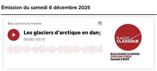 GLACIERS D'ARCTIQUE, ÉTAT DES LIEUX dans LE PARISIEN ![]() Replay de C À VOUS, à 24'04 min ![]() Replay de ÉLÉMENT TERRE ![]() GLACIERS D'ARCTIQUE, ÉTAT DES LIEUX dans MIDI LIBRE, article complet ici ![]() | GLACIERS D'ARCTIQUE, ÉTAT DES LIEUX dans TÉLÉRAMA, article complet ici ![]() Écoutez DÉCRYPTAGE ![]() GLACIERS D'ARCTIQUE, ÉTAT DES LIEUX dans WATER GUETTE, article complet ici ![]() |